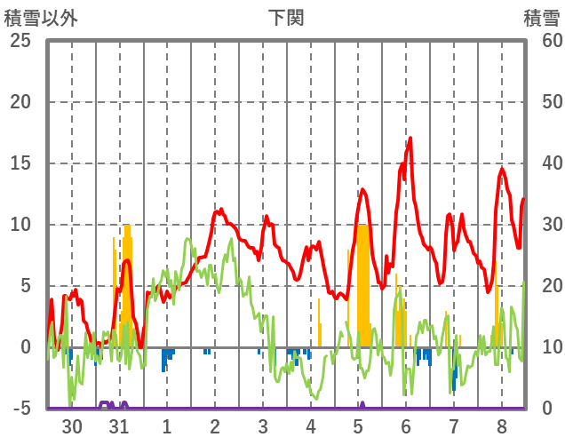 | 日 | 時 | 気温 | 降水 | 風向/風速 | 日照 | 積雪 | 降雪 |