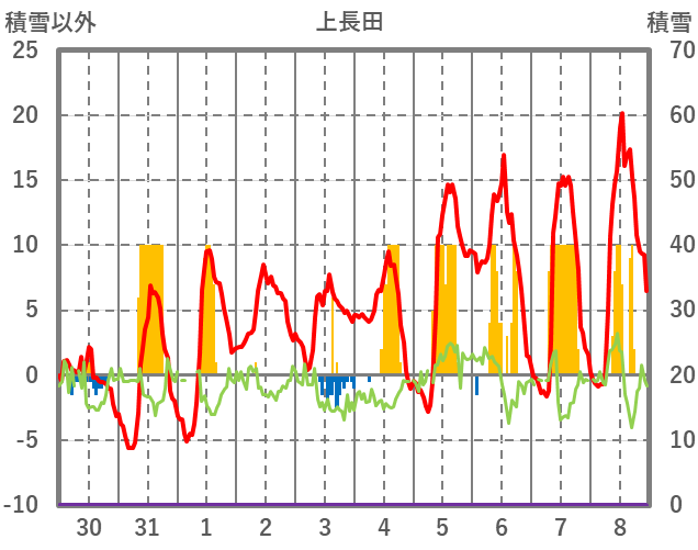 | 日 | 時 | 気温 | 降水 | 風向/風速 | 日照 | 積雪 | 降雪 |