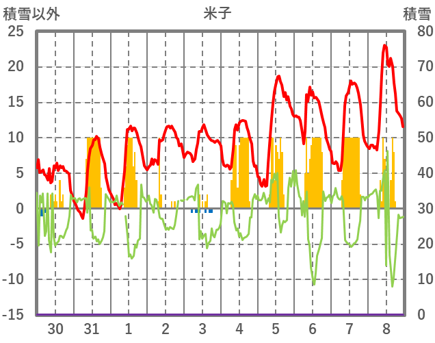 | 日 | 時 | 気温 | 降水 | 風向/風速 | 日照 | 積雪 | 降雪 |