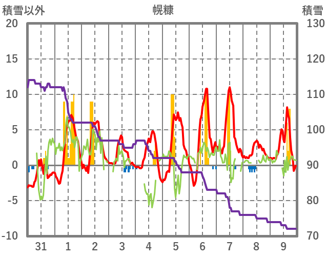 | 日 | 時 | 気温 | 降水 | 風向/風速 | 日照 | 積雪 | 降雪 |