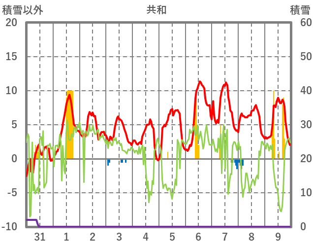 | 日 | 時 | 気温 | 降水 | 風向/風速 | 日照 | 積雪 | 降雪 |