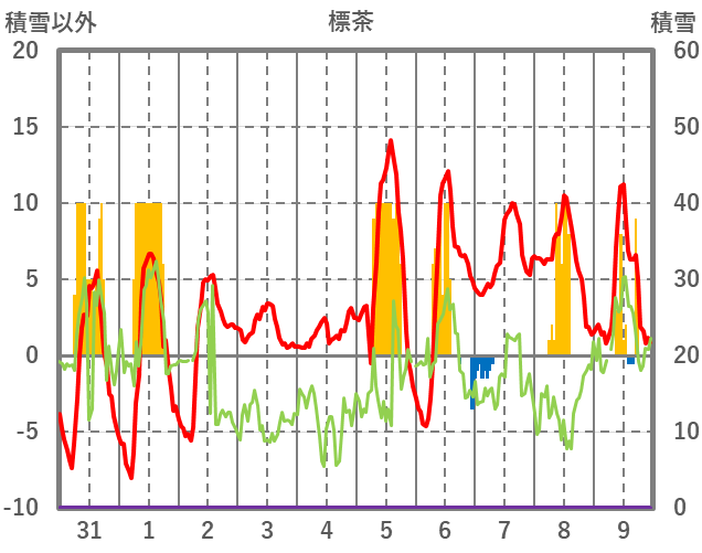 | 日 | 時 | 気温 | 降水 | 風向/風速 | 日照 | 積雪 | 降雪 |