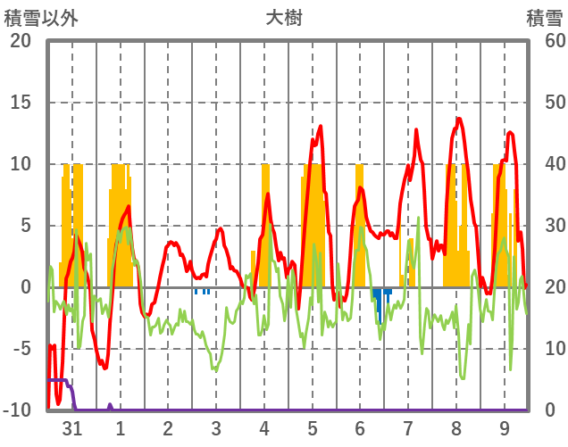 | 日 | 時 | 気温 | 降水 | 風向/風速 | 日照 | 積雪 | 降雪 |