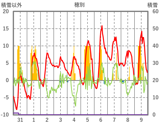 | 日 | 時 | 気温 | 降水 | 風向/風速 | 日照 | 積雪 | 降雪 |