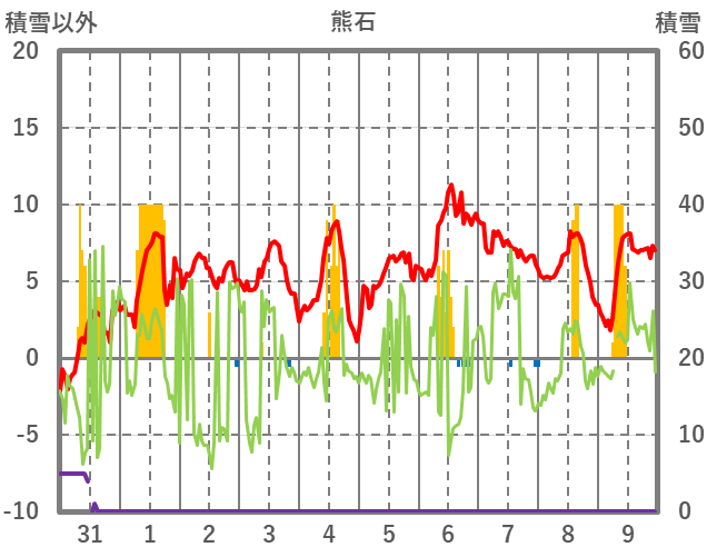 | 日 | 時 | 気温 | 降水 | 風向/風速 | 日照 | 積雪 | 降雪 |