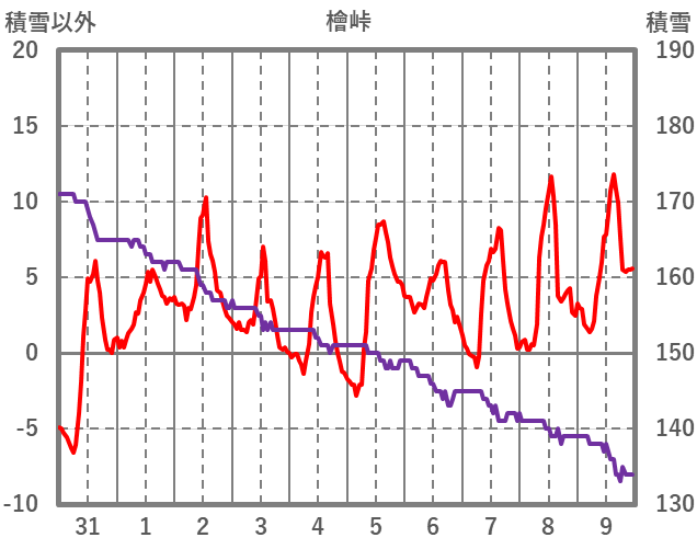 | 日 | 時 | 気温 | 降水 | 風向/風速 | 日照 | 積雪 | 降雪 |