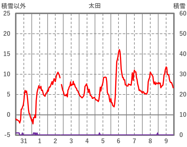 | 日 | 時 | 気温 | 降水 | 風向/風速 | 日照 | 積雪 | 降雪 |