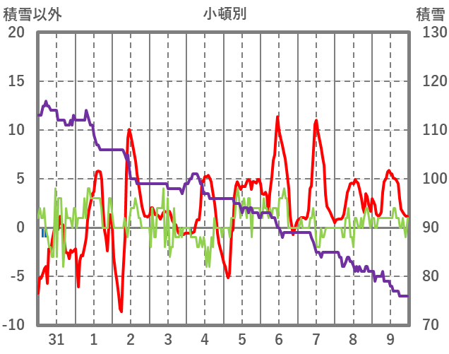 | 日 | 時 | 気温 | 降水 | 風向/風速 | 日照 | 積雪 | 降雪 |