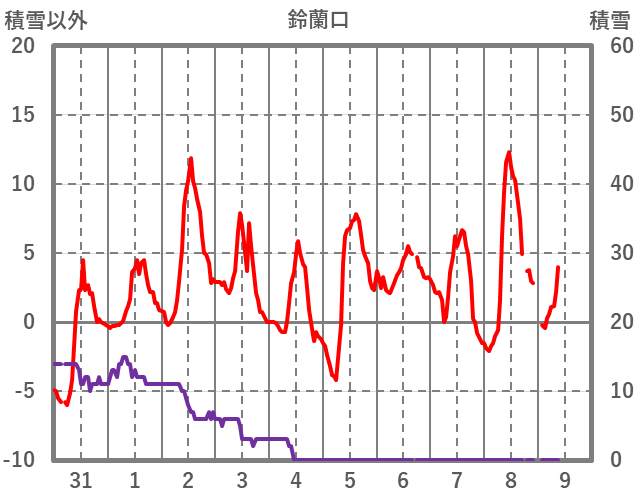 | 日 | 時 | 気温 | 降水 | 風向/風速 | 日照 | 積雪 | 降雪 |
