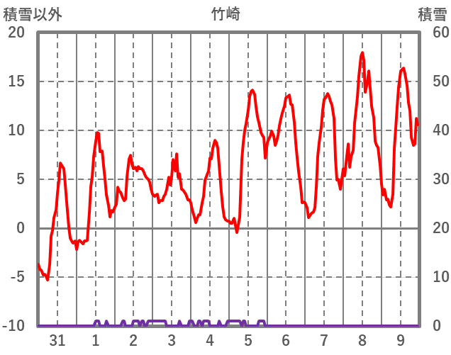| 日 | 時 | 気温 | 降水 | 風向/風速 | 日照 | 積雪 | 降雪 |