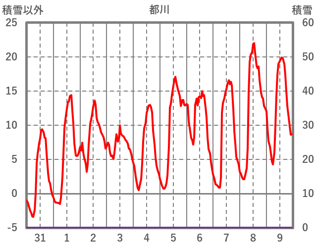 | 日 | 時 | 気温 | 降水 | 風向/風速 | 日照 | 積雪 | 降雪 |