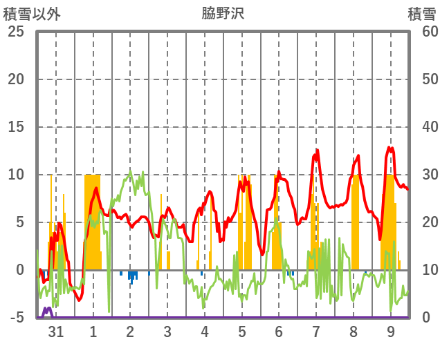 | 日 | 時 | 気温 | 降水 | 風向/風速 | 日照 | 積雪 | 降雪 |