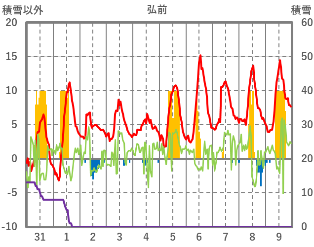 | 日 | 時 | 気温 | 降水 | 風向/風速 | 日照 | 積雪 | 降雪 |