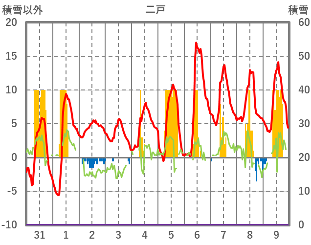 | 日 | 時 | 気温 | 降水 | 風向/風速 | 日照 | 積雪 | 降雪 |