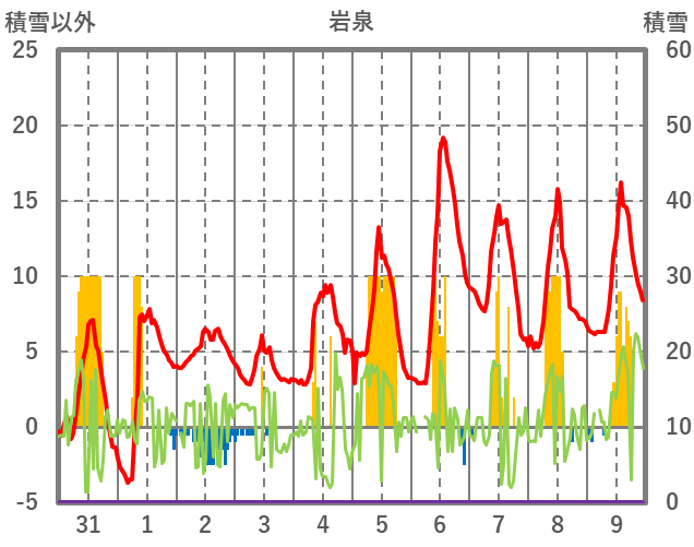 | 日 | 時 | 気温 | 降水 | 風向/風速 | 日照 | 積雪 | 降雪 |