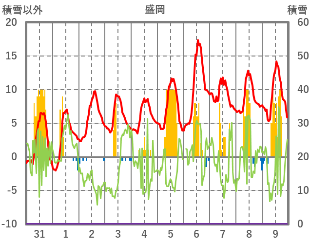 | 日 | 時 | 気温 | 降水 | 風向/風速 | 日照 | 積雪 | 降雪 |