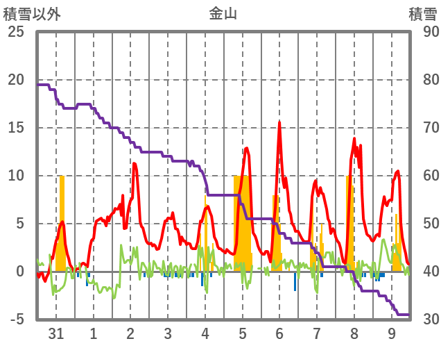 | 日 | 時 | 気温 | 降水 | 風向/風速 | 日照 | 積雪 | 降雪 |