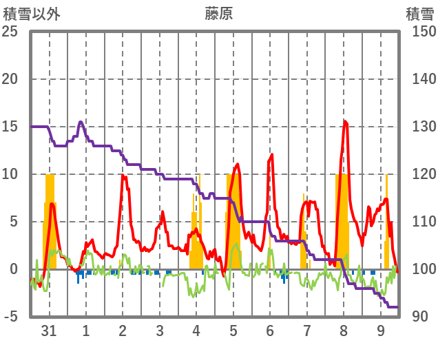 | 日 | 時 | 気温 | 降水 | 風向/風速 | 日照 | 積雪 | 降雪 |