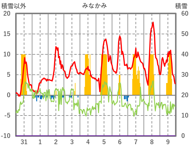 | 日 | 時 | 気温 | 降水 | 風向/風速 | 日照 | 積雪 | 降雪 |