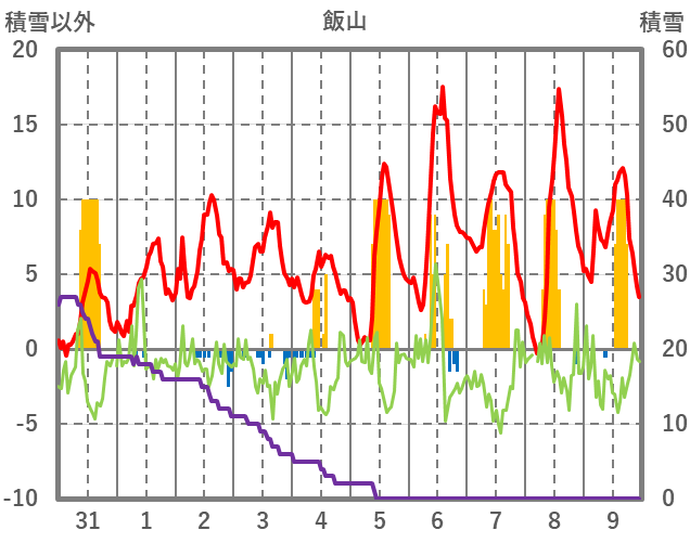 | 日 | 時 | 気温 | 降水 | 風向/風速 | 日照 | 積雪 | 降雪 |