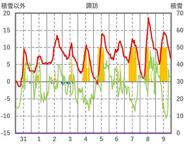 | 日 | 時 | 気温 | 降水 | 風向/風速 | 日照 | 積雪 | 降雪 |