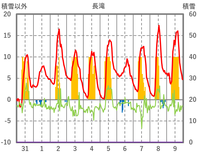 | 日 | 時 | 気温 | 降水 | 風向/風速 | 日照 | 積雪 | 降雪 |