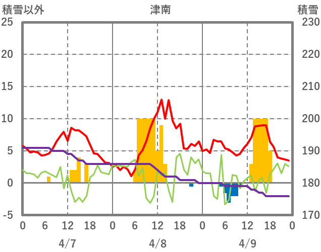 | 日 | 時 | 気温 | 降水 | 風向/風速 | 日照 | 積雪 | 降雪 |