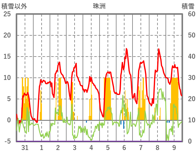 | 日 | 時 | 気温 | 降水 | 風向/風速 | 日照 | 積雪 | 降雪 |