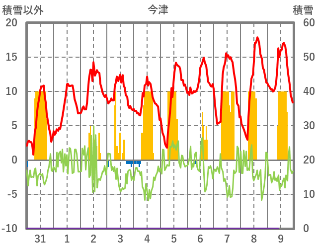 | 日 | 時 | 気温 | 降水 | 風向/風速 | 日照 | 積雪 | 降雪 |