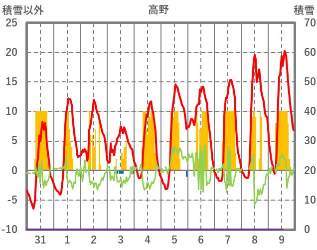 | 日 | 時 | 気温 | 降水 | 風向/風速 | 日照 | 積雪 | 降雪 |