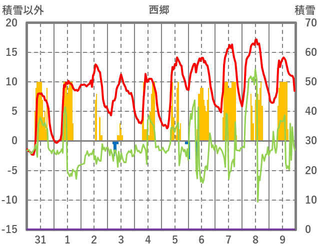 | 日 | 時 | 気温 | 降水 | 風向/風速 | 日照 | 積雪 | 降雪 |