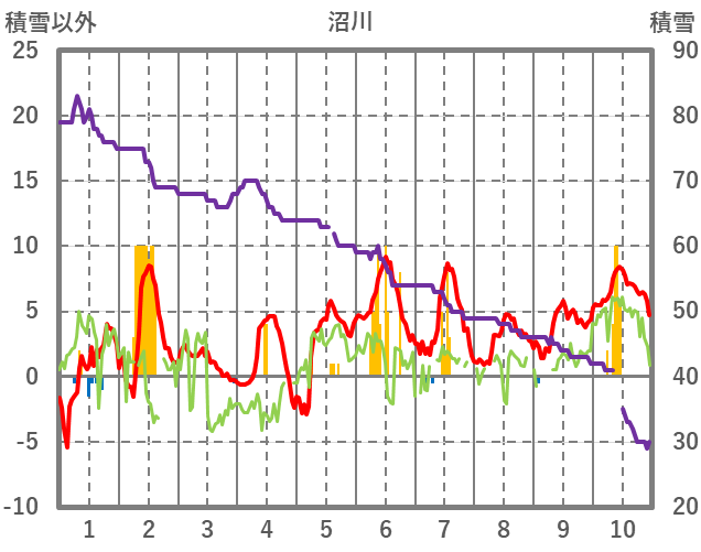 | 日 | 時 | 気温 | 降水 | 風向/風速 | 日照 | 積雪 | 降雪 |