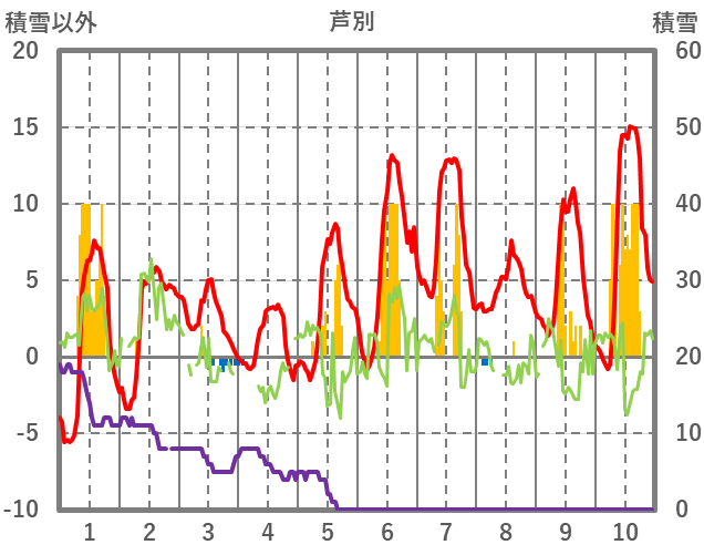 | 日 | 時 | 気温 | 降水 | 風向/風速 | 日照 | 積雪 | 降雪 |