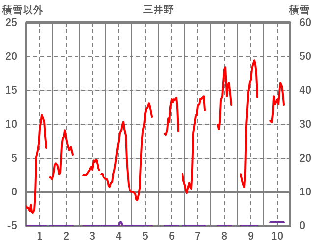 | 日 | 時 | 気温 | 降水 | 風向/風速 | 日照 | 積雪 | 降雪 |