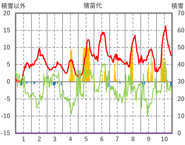| 日 | 時 | 気温 | 降水 | 風向/風速 | 日照 | 積雪 | 降雪 |
