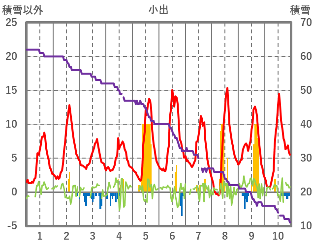 | 日 | 時 | 気温 | 降水 | 風向/風速 | 日照 | 積雪 | 降雪 |