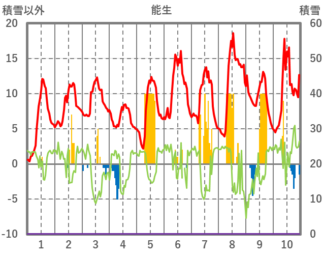 | 日 | 時 | 気温 | 降水 | 風向/風速 | 日照 | 積雪 | 降雪 |