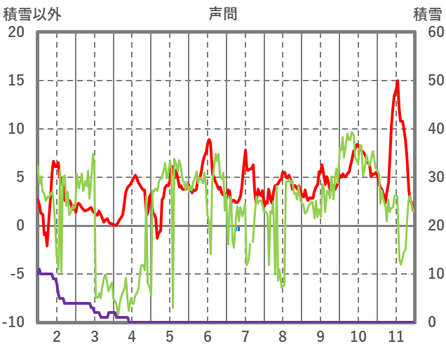 | 日 | 時 | 気温 | 降水 | 風向/風速 | 日照 | 積雪 | 降雪 |
