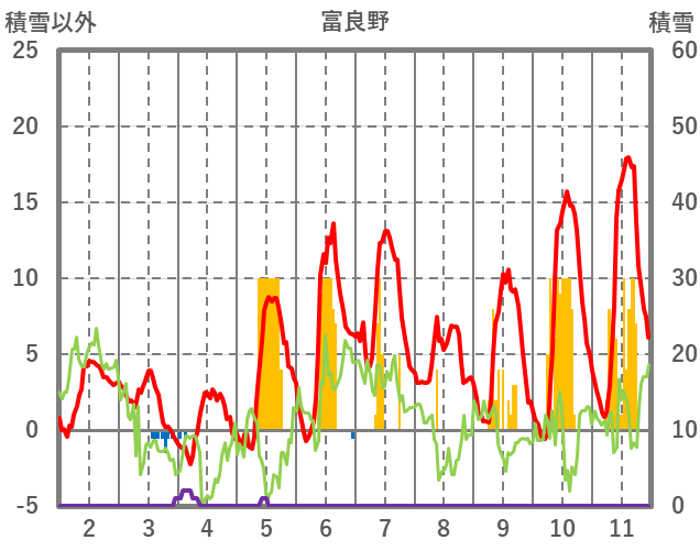 | 日 | 時 | 気温 | 降水 | 風向/風速 | 日照 | 積雪 | 降雪 |