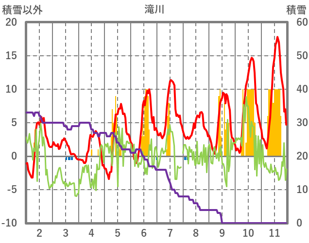 | 日 | 時 | 気温 | 降水 | 風向/風速 | 日照 | 積雪 | 降雪 |