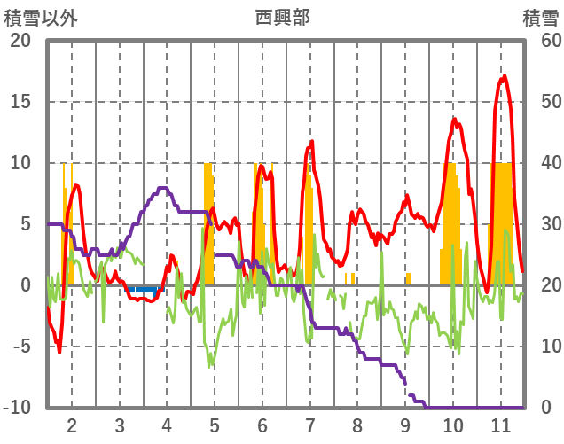 | 日 | 時 | 気温 | 降水 | 風向/風速 | 日照 | 積雪 | 降雪 |