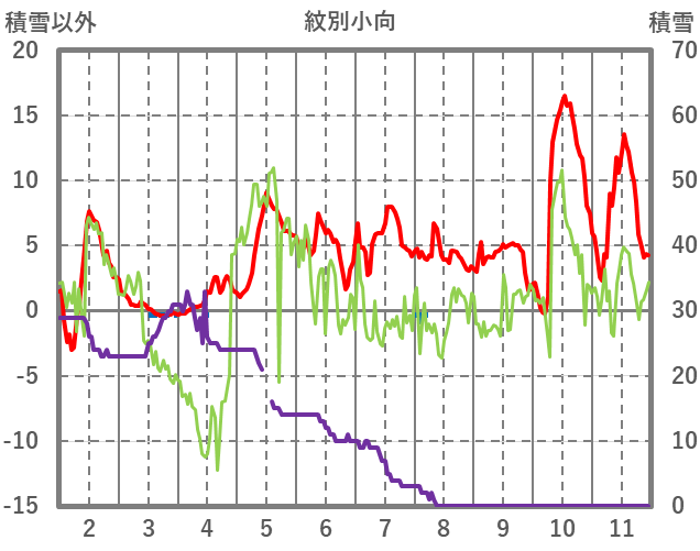 | 日 | 時 | 気温 | 降水 | 風向/風速 | 日照 | 積雪 | 降雪 |