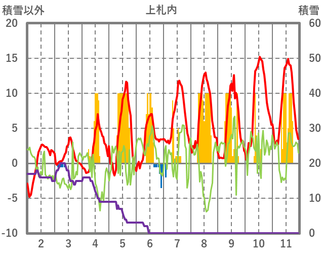 | 日 | 時 | 気温 | 降水 | 風向/風速 | 日照 | 積雪 | 降雪 |