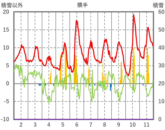 | 日 | 時 | 気温 | 降水 | 風向/風速 | 日照 | 積雪 | 降雪 |