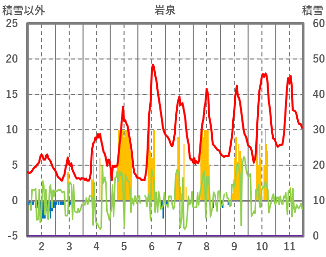 | 日 | 時 | 気温 | 降水 | 風向/風速 | 日照 | 積雪 | 降雪 |