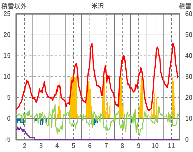 | 日 | 時 | 気温 | 降水 | 風向/風速 | 日照 | 積雪 | 降雪 |