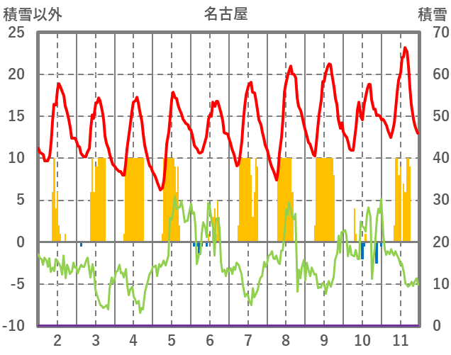 | 日 | 時 | 気温 | 降水 | 風向/風速 | 日照 | 積雪 | 降雪 |