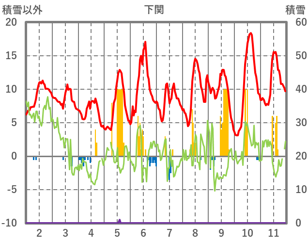 | 日 | 時 | 気温 | 降水 | 風向/風速 | 日照 | 積雪 | 降雪 |