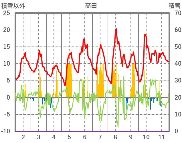 | 日 | 時 | 気温 | 降水 | 風向/風速 | 日照 | 積雪 | 降雪 |