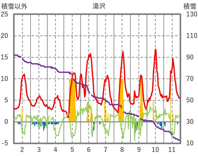 | 日 | 時 | 気温 | 降水 | 風向/風速 | 日照 | 積雪 | 降雪 |